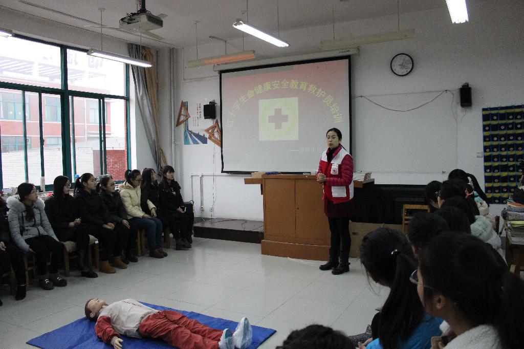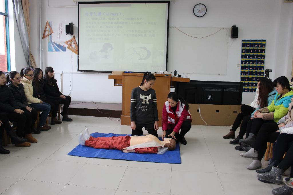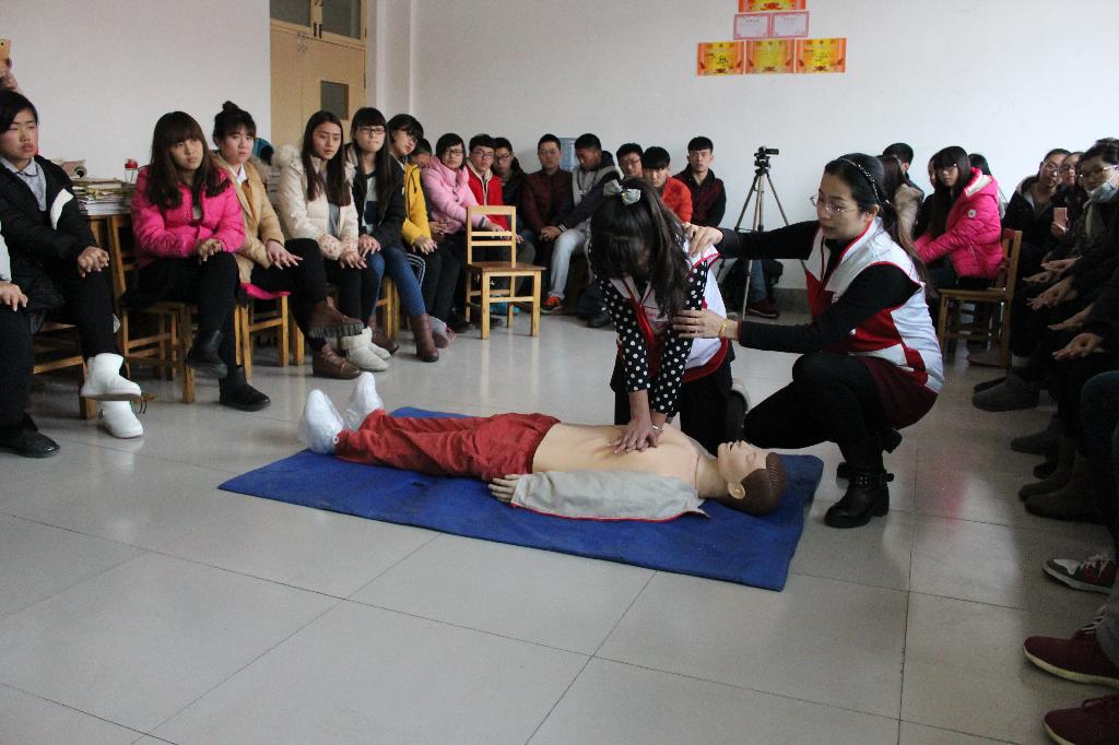 为了加强校园安全教育,提高学生应急救护意识及能力,数理科学系取得救护员师资证的王程玉老师受淄博市红十字会委派对学生进行了红十字生命健康安全教育救护员培训。