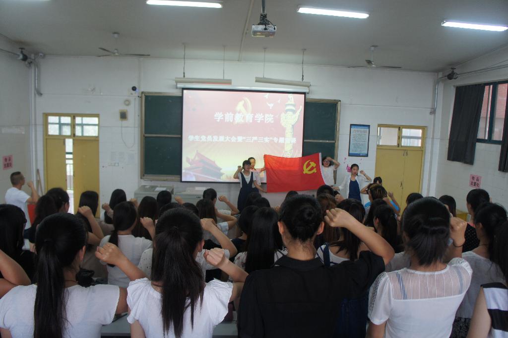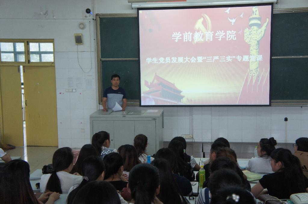 2015年6月4日下午,学前教育学院在第七阶梯教室举行了学生党员发展大会暨“三严三实”专题党课活动。会议由学前教育学院学生党支部书记主持,学生党支部17名正式党员、53名预备党员参加会议,学前教育学院党总支副书记在会上讲了“从严从实,争做优秀共产党员”的专题党课。