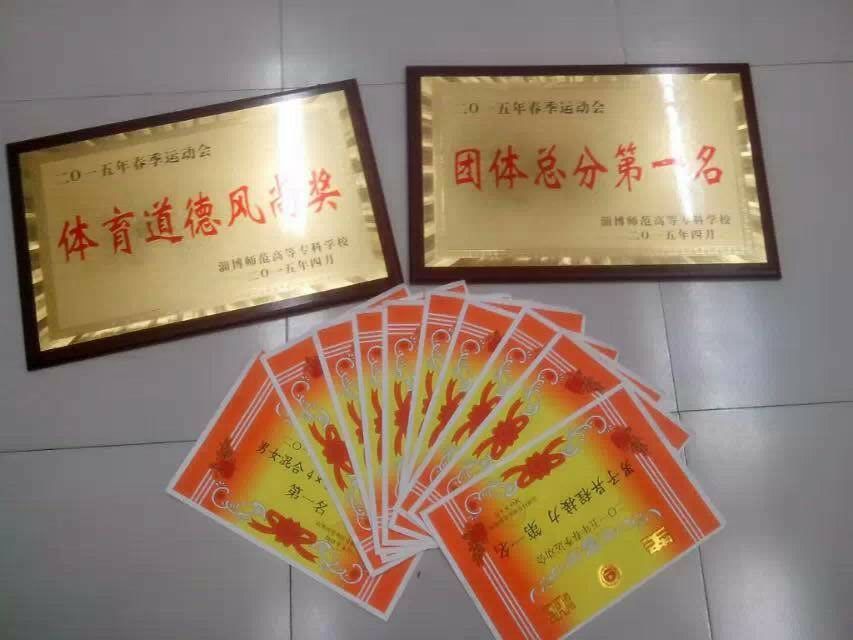 淄博师范高等专科学校2015年春季运动会圆满结束,经过全院师生的共同努力,学院教育学院取得团体总分第一名,体育道德风尚奖的优异成绩。本次运动会学前教育学院承担了开幕式大型太极扇表演《太极神韵》、大型舞蹈表演《梦幻师专》,得到了师生的一致好评。据统计,在今年的运动会中女子跳远、女子跳高等两个项目打破学校记录;学生单项有15人获得第一名、9人获得第二名、14人获得第三名、24人获得前八名;团体项目中,11个项目喜获第一名,2个项目喜获第三名;2个项目喜获第四名。此外,教工4×100米获得冠军。