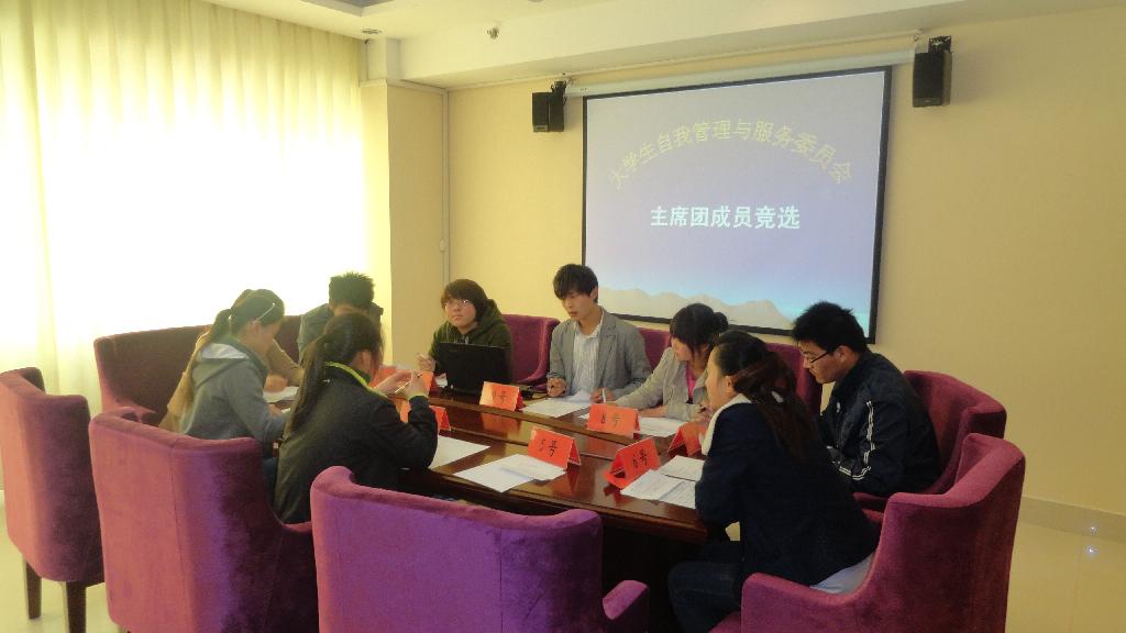 “大学生自我管理与服务委员会” 是经学校同意,在原“大学生自律委员会”的基础上改组成立。“自管会”的成立是为了更好的以“生本管理”理念推进学生教育与管理工作,发挥大学生在学生事务管理与服务工作中的作用,进一步扩大学生在教育管理工作中的参与,拓宽对学生骨干队伍的培养。参加主席团竞选的10名候选人按照任职条件由院系和上届委员会推荐产生,最终,马玉杨、王芮、马萍、施洋、胡晓宁、王清波、王红七名同学赢得了7个主席团的席位。