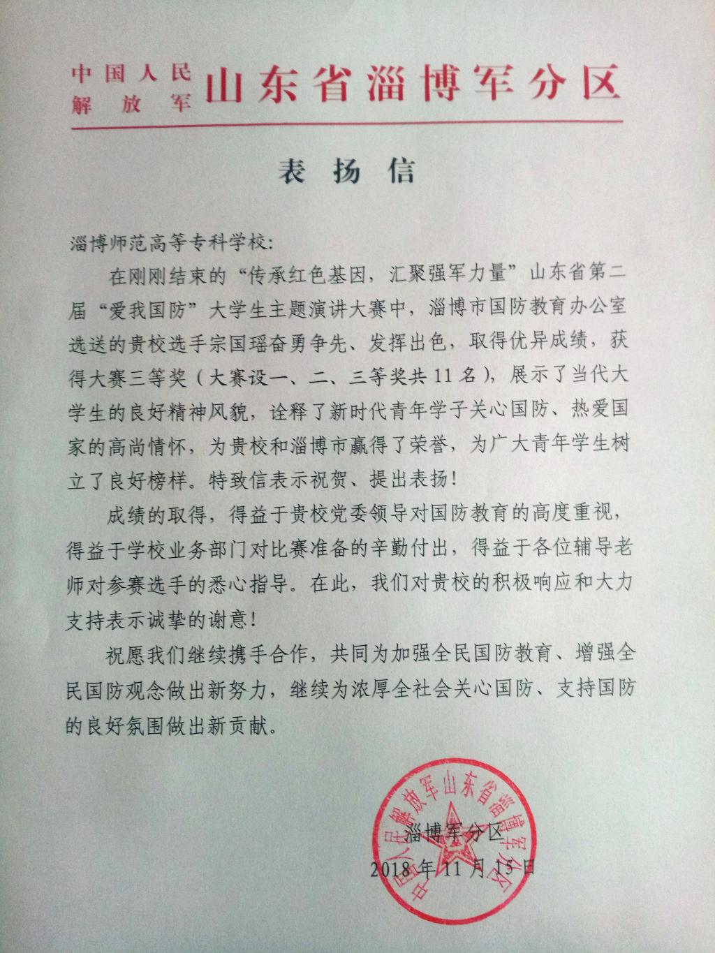 11月15日,我校收到淄博军分区发来的表扬信。淄博军分区就我校学生宗国瑶在山东省第二届“爱我国防”大学生主题演讲大赛中取得的优异成绩,特发表扬信以示感谢,同时对我校国防教育工作给予赞扬和肯定,并表示今后与我校继续携手合作,共同为国防事业做贡献。