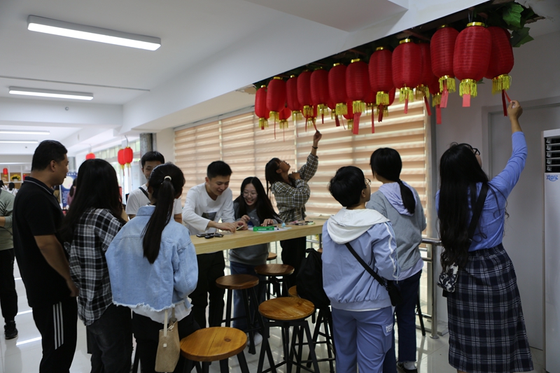 在事务大厅内悬挂着挂有灯谜的红灯笼,供同学们进行猜月迷活动,在游戏中,增长传统文化知识,体味传统文化的韵味,颇受同学们的喜爱。