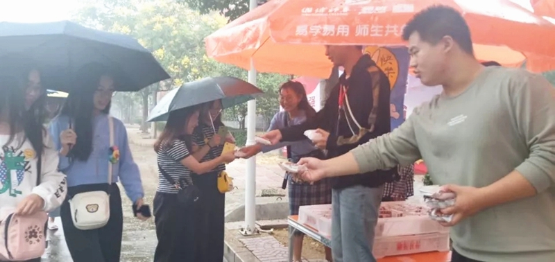 中秋节当天,冒着蒙蒙细雨,学校在公寓区为留校的学生分发月饼,将学校对大家的关怀传递到每一个学生的心中。