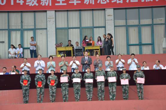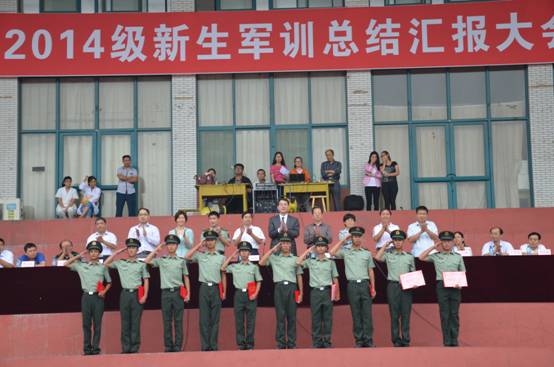 会上,周巧玲副校长宣读了2014级新生军训工作先进集体和先进个人表彰通报。部队首长李少卿代表承训部队讲话,向2014级军训工作的圆满结束表示祝贺,并希望全体参训学生在即将到来的大学生生活中,保持军训中养成的优良作风,努力学习,报效祖国。车文静老师代表全体老师向承训教官表示感谢,向2014级新生表示欢迎,希望新生能够在大学生活中有一份难忘的回忆。新生代表邱爽与大家分享了自己的军训感悟,并向2014级新生送上寄语。