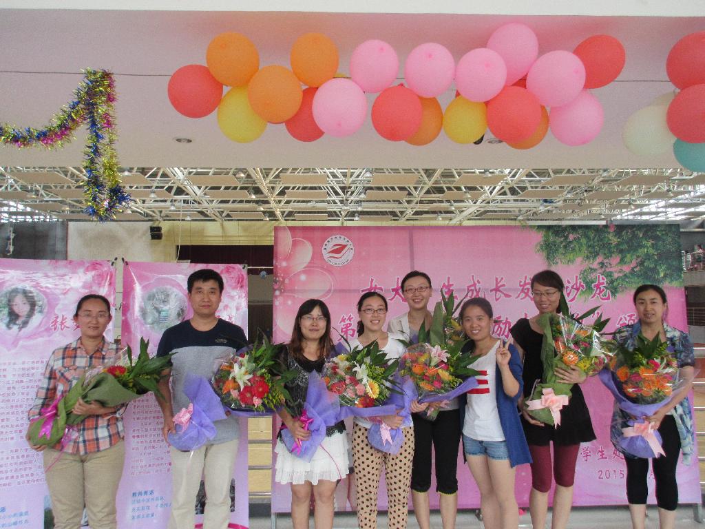 在十佳女大学生给提名教师献花的过程中,老师与学生热情拥抱,互送祝福,真挚的画面感染了在场的每一个人。 随后,师生们自由围坐,一边品着点心、水果,一边自由的交流、合影。不少同学大呼从未感觉与老师如此亲近过,十分感谢这次活动的举办。